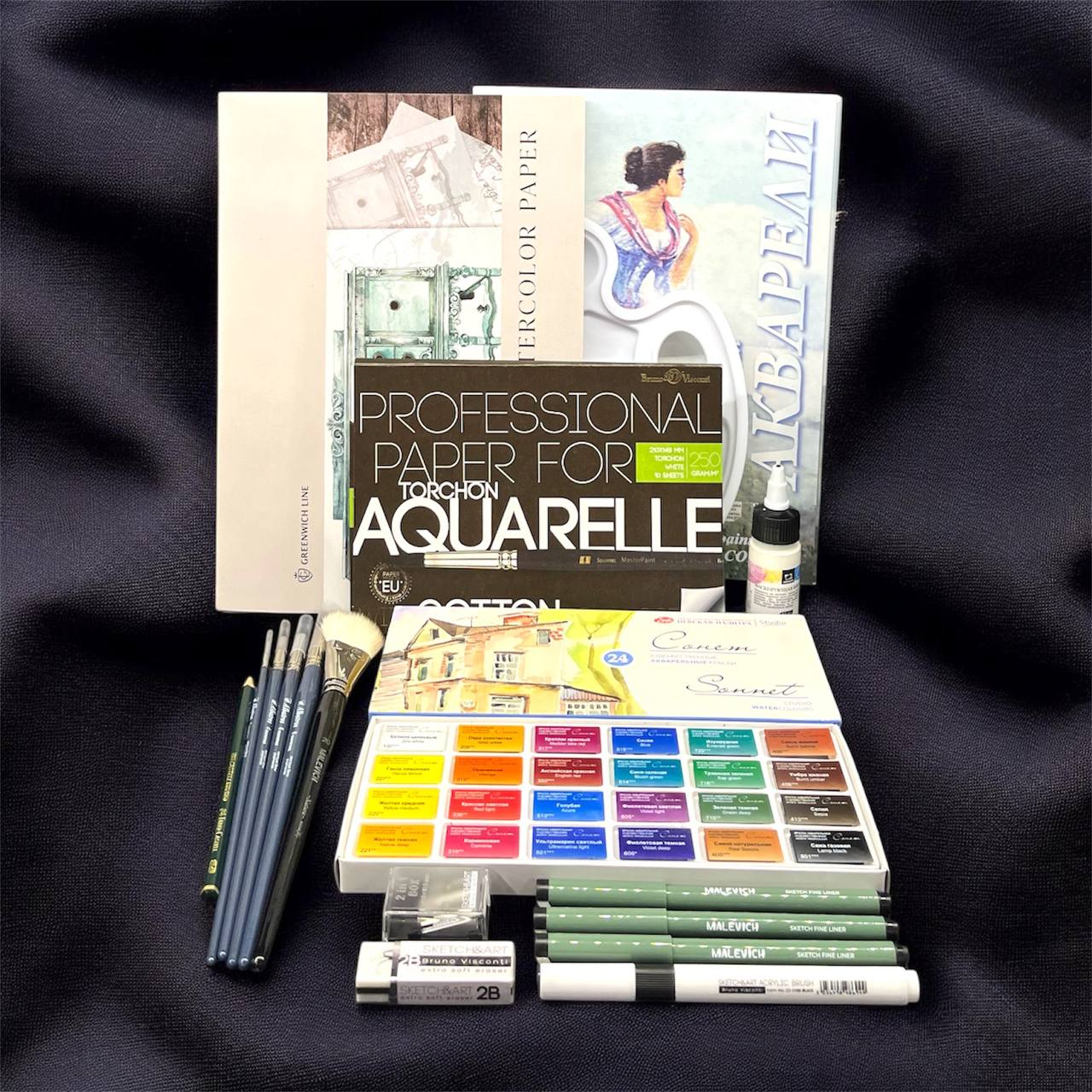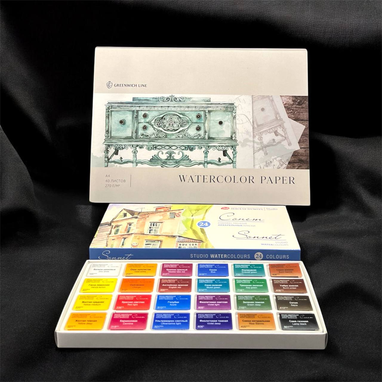 Полный комплект для первых шагов в акварельной живописи. Готовый подарок!