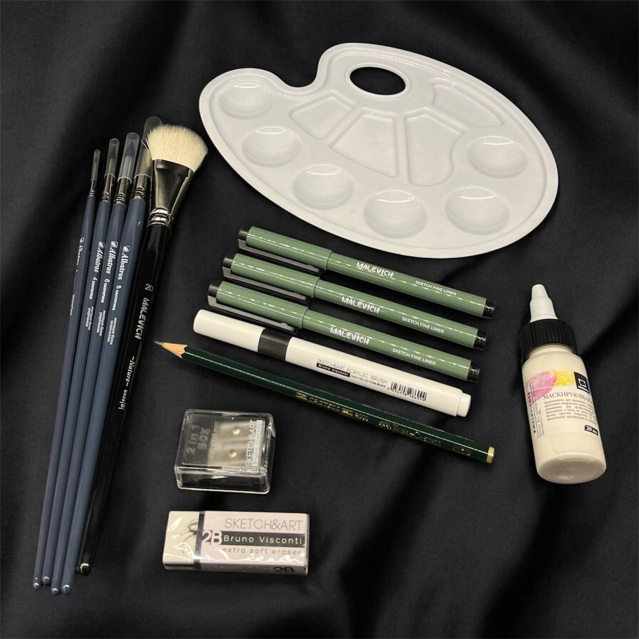 Набор укомплектован материалами от проверенных производителей: краски «Сонет», бумага Greenwich Line и «Рыбачка», кисти «Малевичъ», карандаш Faber-Castell и многое другое.