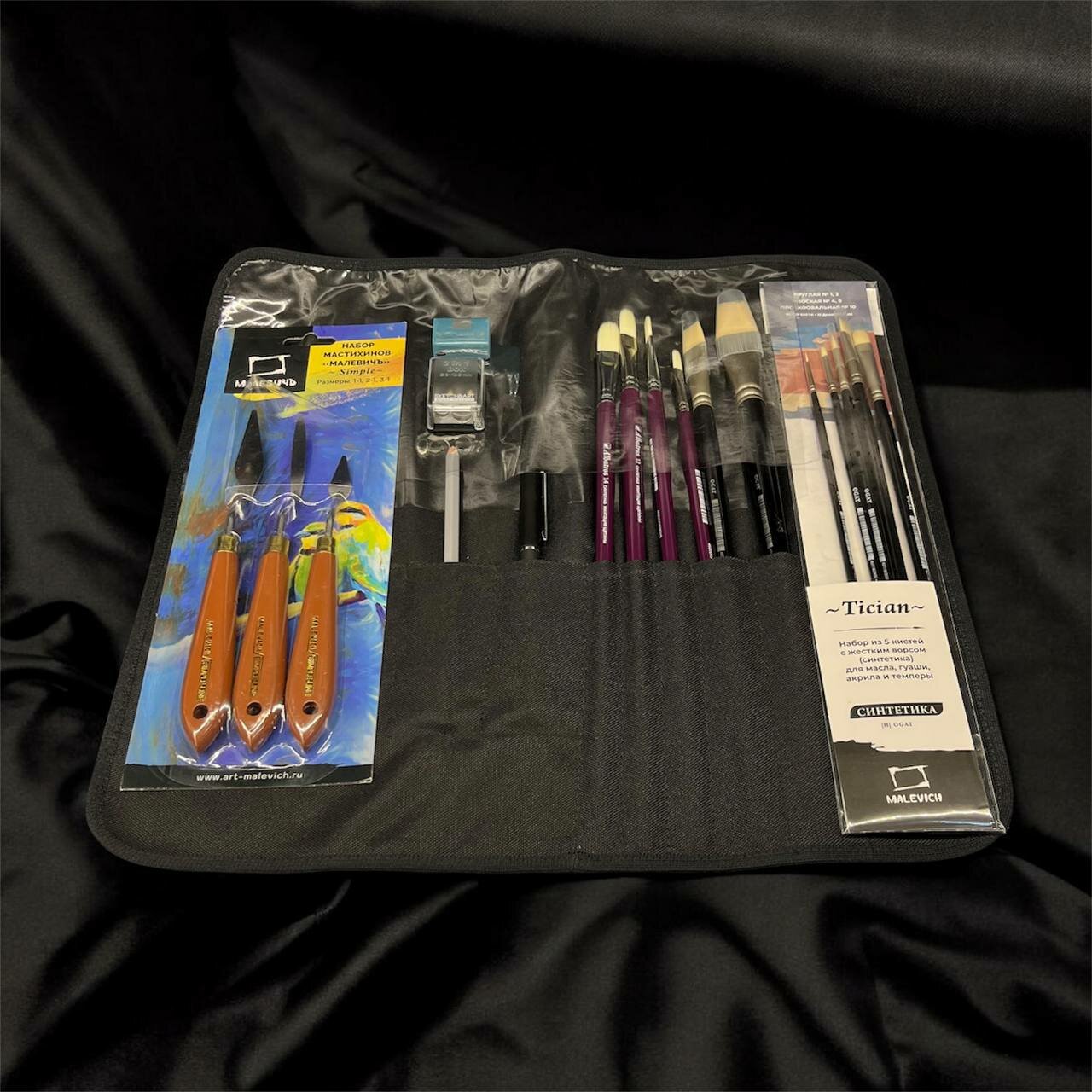 - Профессиональные инструменты: Набор кистей «Тициан» и имитация щетины для тончайшей детализации и смелых фактурных мазков. Набор мастихинов для создания рельефных картин.