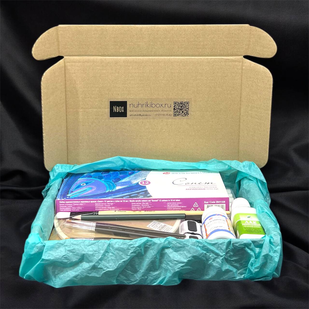 ✅ Полная готовность. Всё, что может понадобиться новичку в одном наборе: 12 ярких красок, кисти, холсты, палитра и средства для фиксации рисунка (лак). Не нужно ничего докупать.