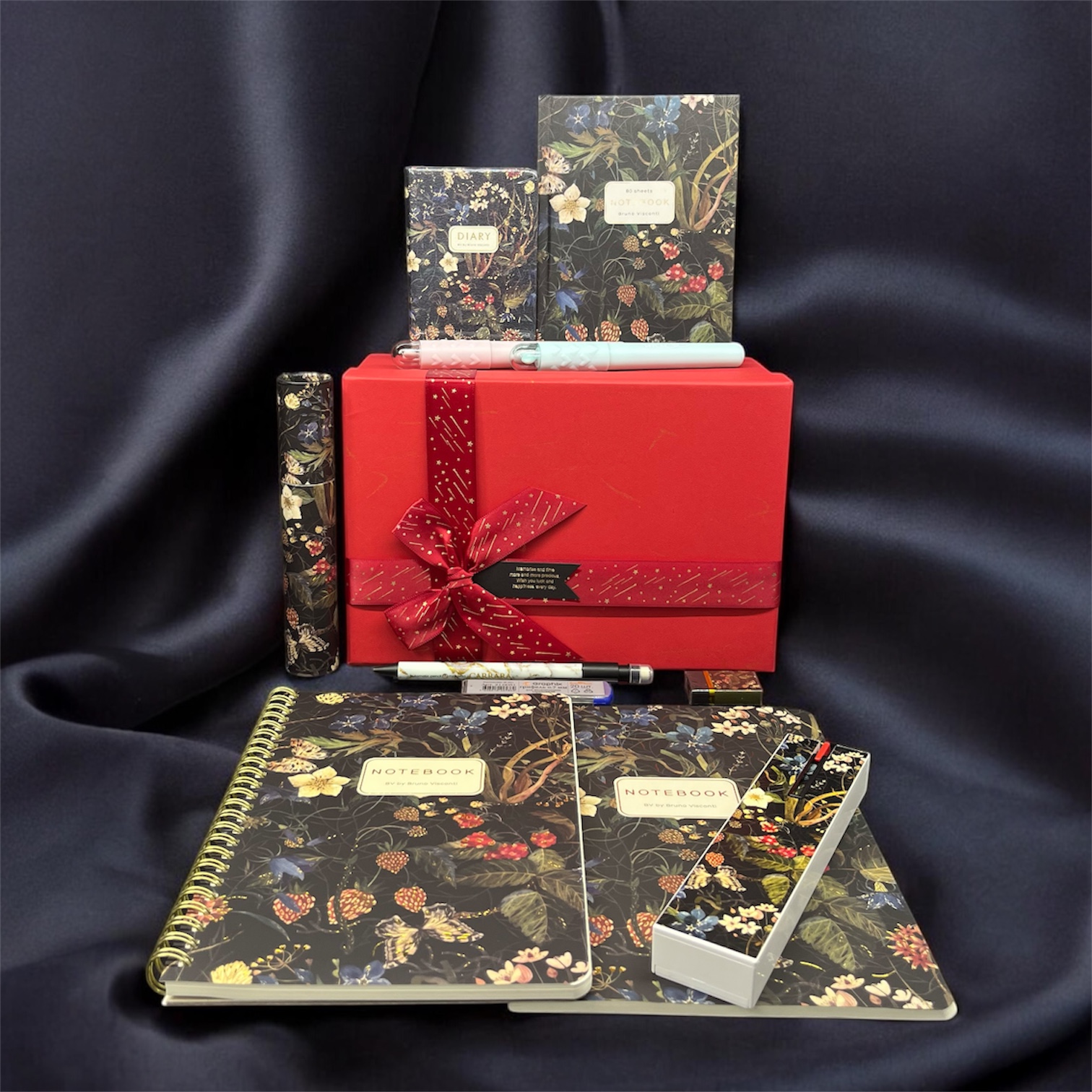 Элегантное сочетание глубокого черного и благородного красного с нежным принтом «Лесные ягоды» выглядит дорого и современно. Такой подарок не запылится на полке — всем предметам найдется применение каждый день.