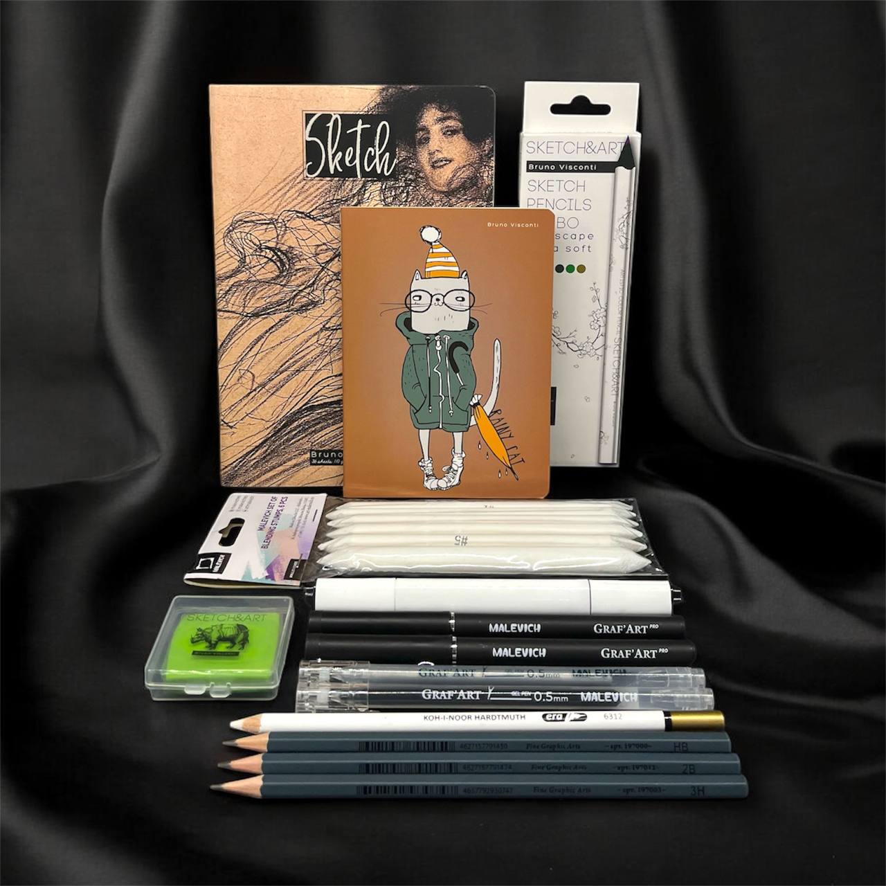 В состав набора входят линеры, цветные карандаши, набор растушевок, ластики, точилки, гелевые ручки, скетчбук и блокнот. Все предметы изготовлены из качественных материалов, обеспечивающих долгий срок службы и удобство использования.