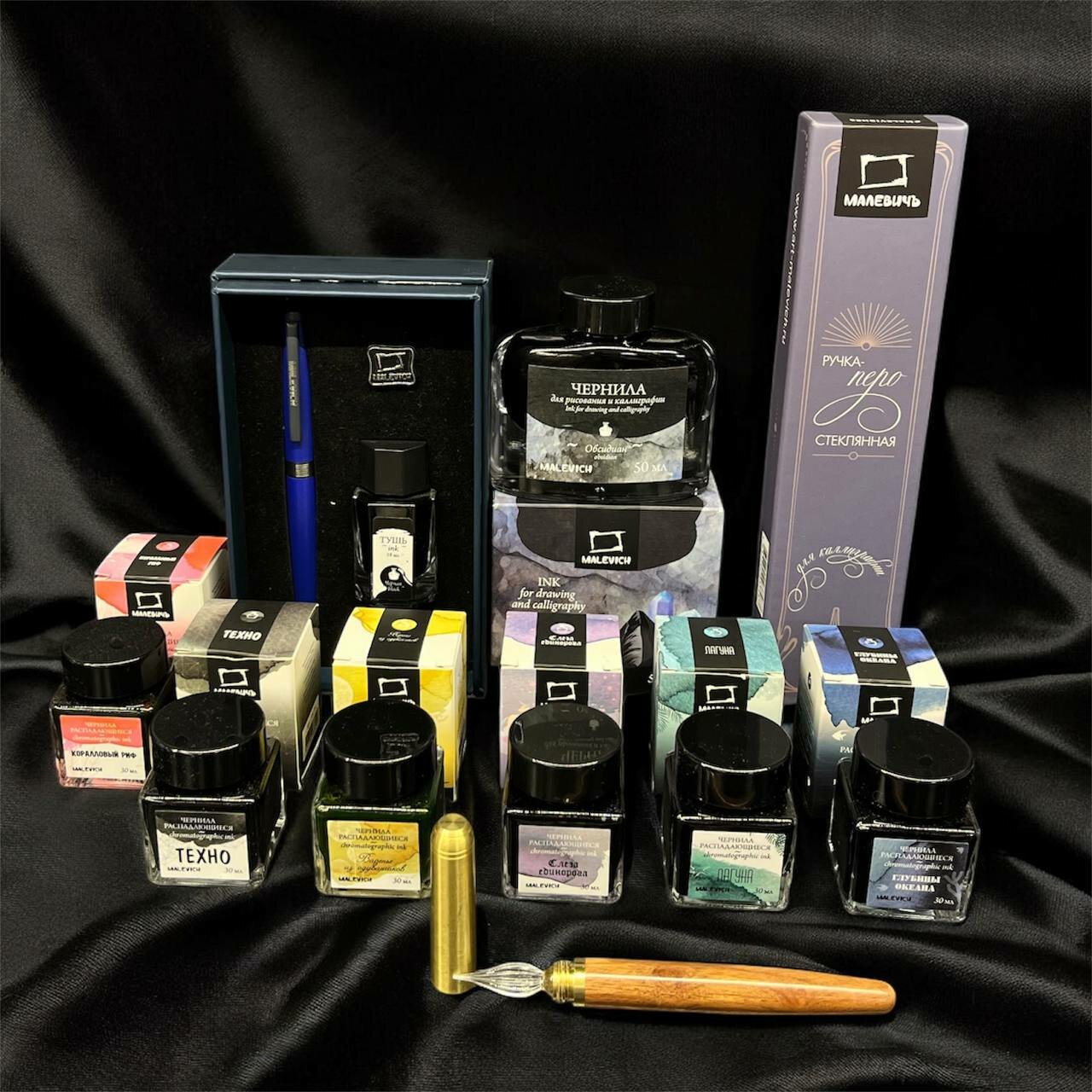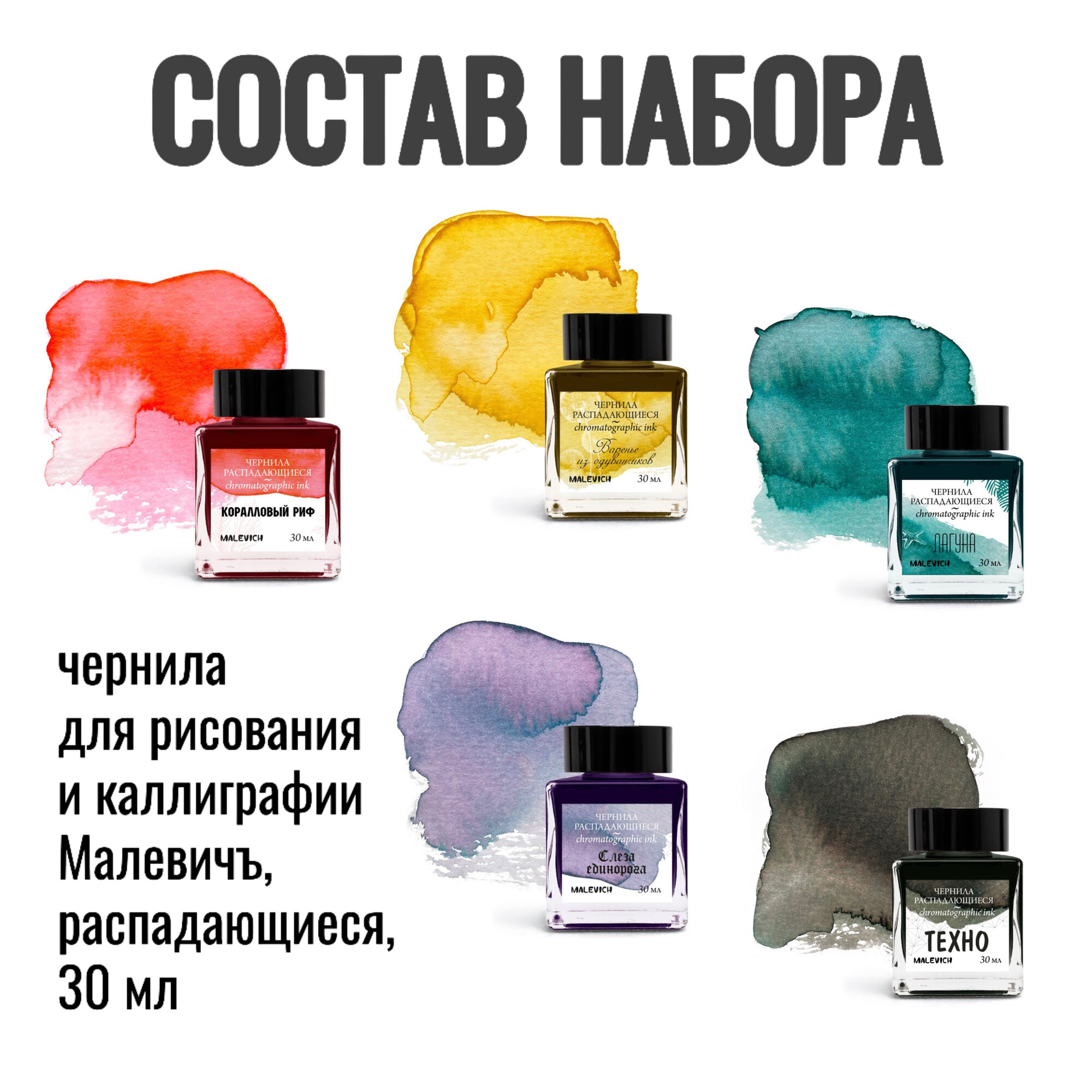 Симфония цвета: 6 пузырьков чернил «Малевичъ» по 30 мл! Это целая палитра оттенков для ваших экспериментов. Позвольте буквам играть цветом!