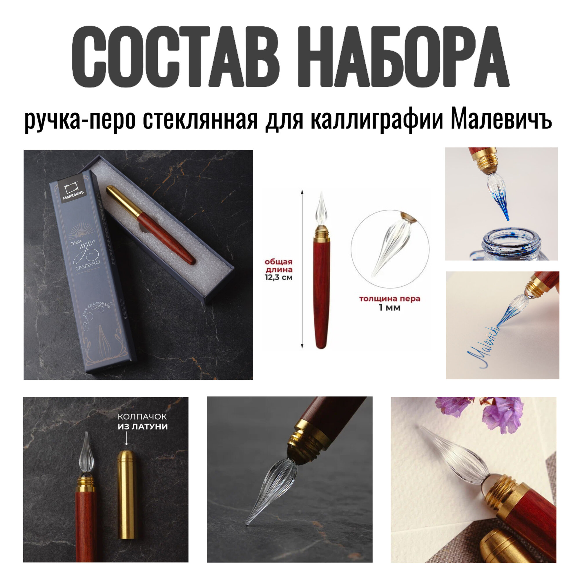 Стеклянная ручка-перо: Главная драгоценность набора. Её изящное перо, закрученное спиралью, не только красиво, но и практично — оно долго держит каплю чернил, позволяя писать плавно и без лишних маканий.