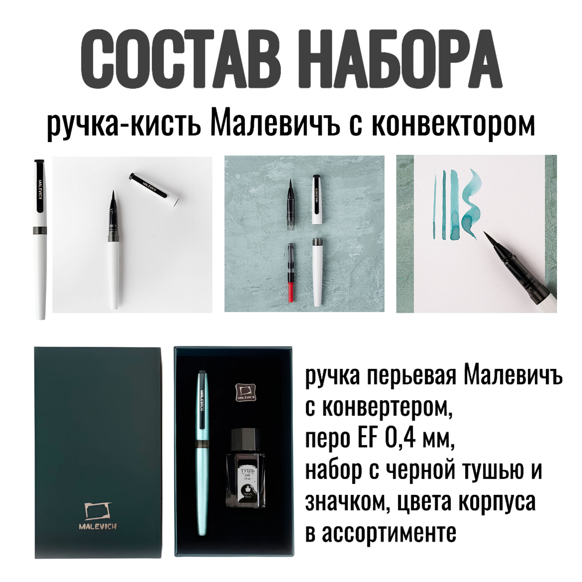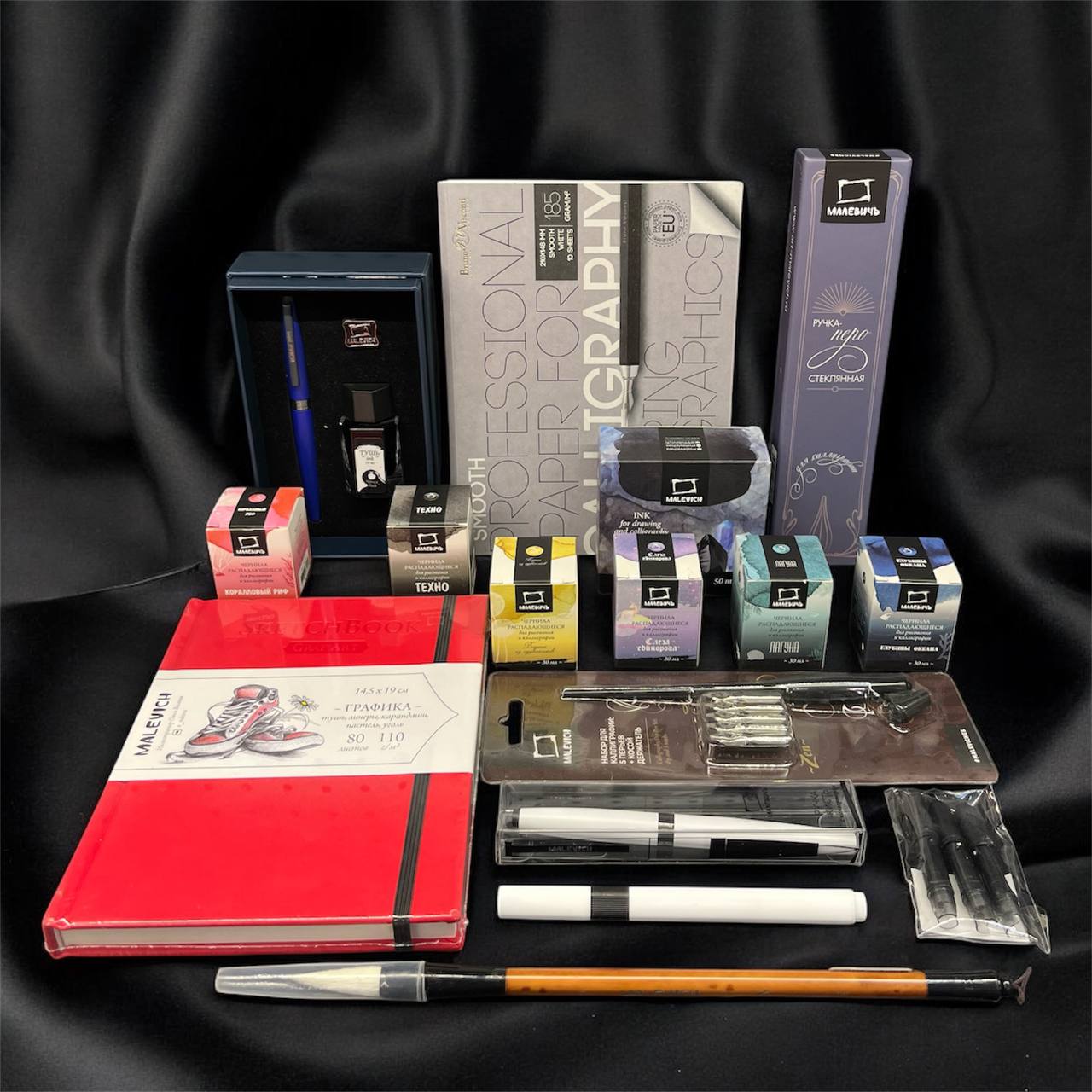 Простор для творчества: Целых 2 блокнота! Специальная бумага для каллиграфии (чтобы чернила не растекались) и вместительный скетчбук «Малевичъ» (110г/м, 80л) для ваших рисунков, идей и первых каллиграфических шедевров.
