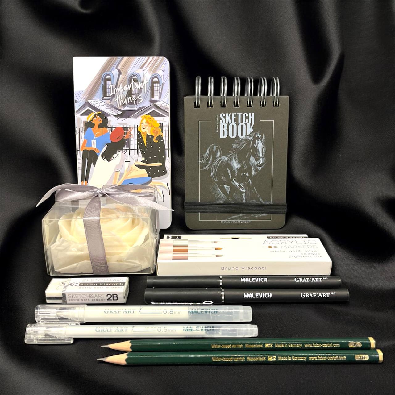 База и качество: Легендарные чернографитные карандаши Faber-Castell и супермягкий ластик для идеальных набросков.