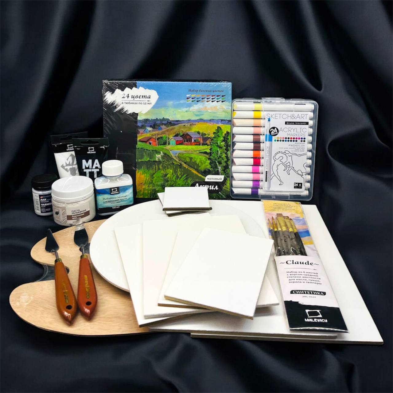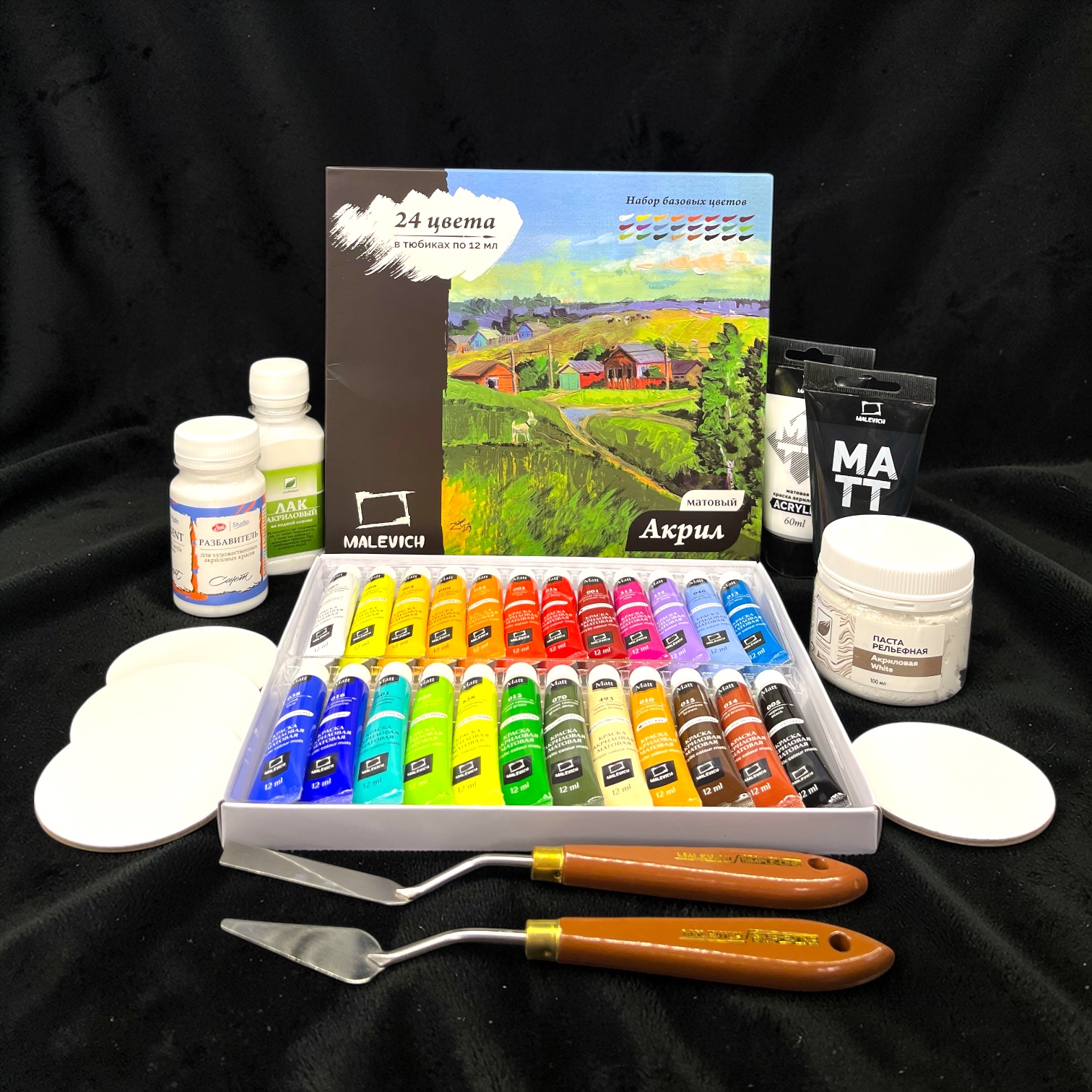 Матовые акриловые краски (24 цвета): Базовый набор для классической живописи. Цвета легко смешиваются между собой.
