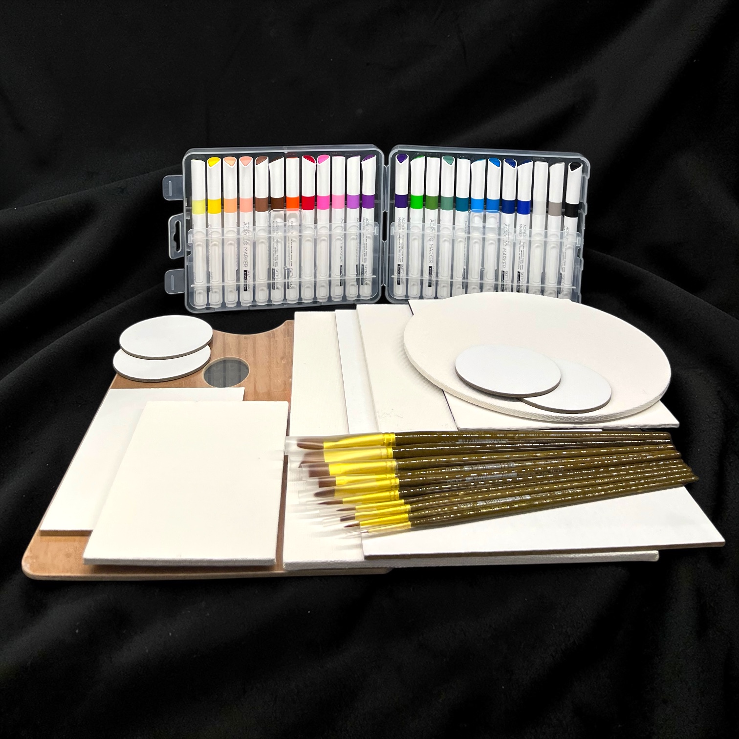 Акриловые маркеры (24 цвета): Пигментированные, не текут, рисуют по любым поверхностям — стекло, дерево, керамика, пластик, камень.