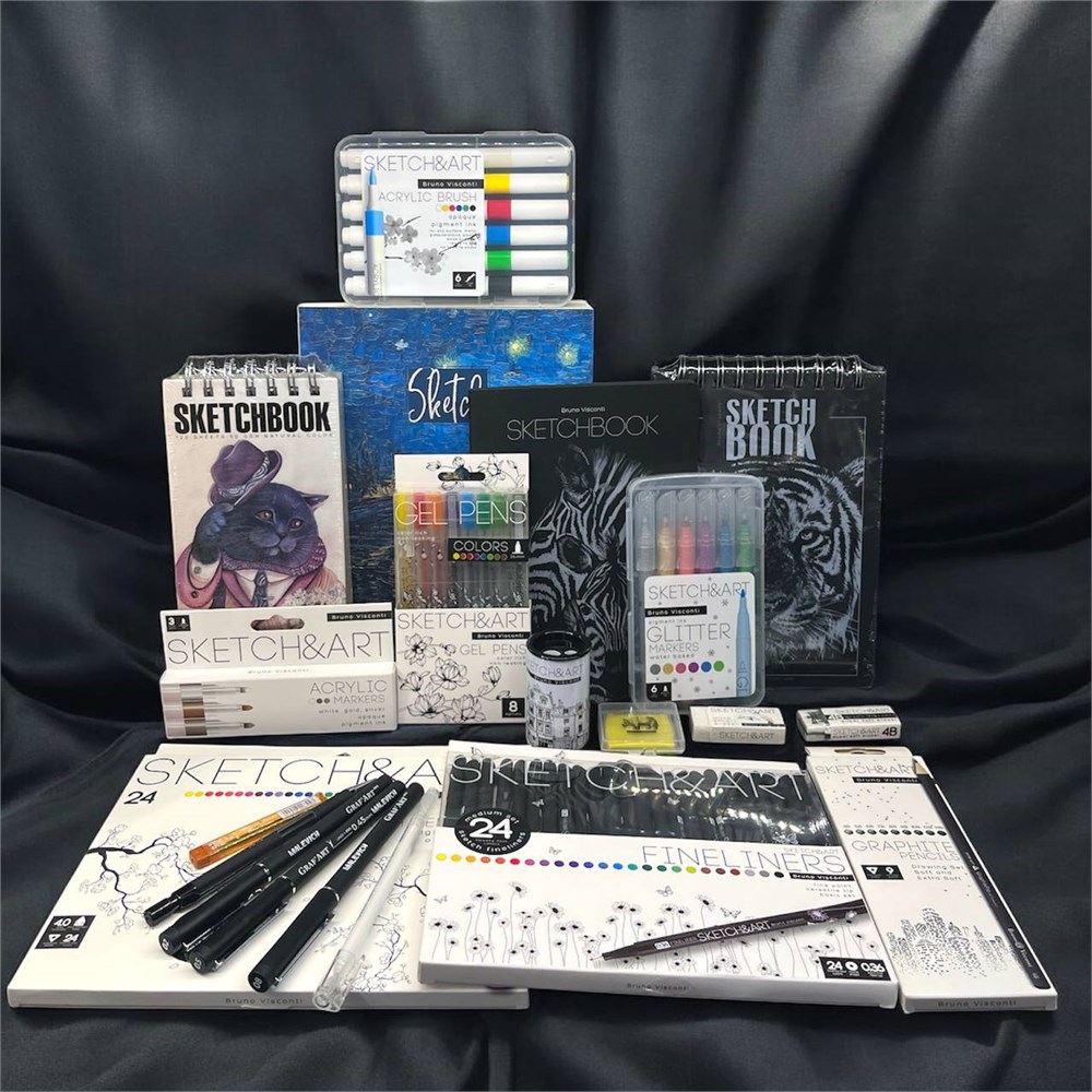 Набор включает в себя все необходимые инструменты для рисования. В него входят скетчбуки, точилка, ластики, а также капиллярные ручки, чернографитные карандаши, цветные карандаши. Все эти предметы помогут вам создать яркие и насыщенные рисунки, а также легко корректировать их.